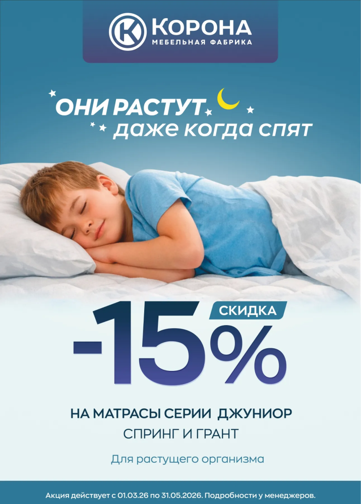 Забота о здоровом сне детей — наш приоритет. Специально для вас мы запускаем акцию на детские матрасы серии «Джуниор»! Только до 31 мая 2026 года на модели «Спринг» и «Гранд» действует скидка 15%.